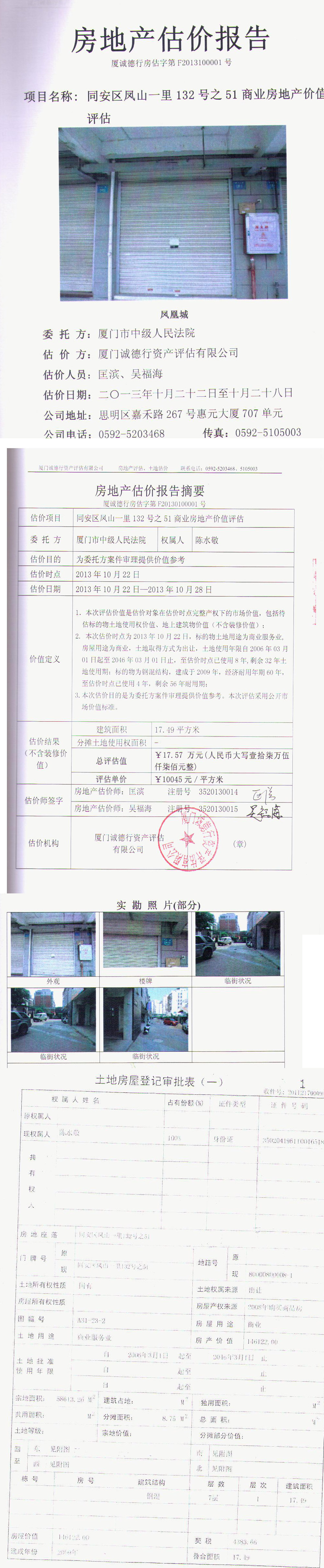 厦门市同安区凤山一里132号之51商业房地产,建筑面积:17.49㎡,评估价:17.57万元